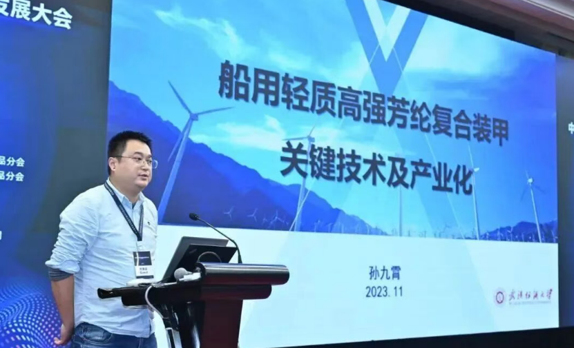 2023年12月在北京举行的中国纺织工业联合会科学技术奖励大会颁奖仪式上,孙九霄副教授团队“船用轻质高强芳纶复合装甲关键技术及产业化”曾荣获科技进步一等奖,该项目在高韧性芳纶纺丝成纤及表面处理技术、高韧热塑性树脂研制和自动化热压成型装备开发等方面获得突破,形成了具有自主知识产权的船用芳纶复合装甲成套技术,开发了多层织物/树脂膜自动化交叉铺层设备、研制了多模并行一步法热压成型设备和自洁式快速自动脱模装置,建立了船用芳纶复合装甲自动化生产线,实现了船用芳纶复合装甲的规模化生产,项目产品在舰船等领域广泛应用,经济社会效益显著。项目开发的船用轻质高强芳纶复合装甲关键技术与装备,扭转了关键材料长期依赖国外进口的被动局面,突破了船用芳纶复合装甲“卡脖子”难题,提升了我国舰船的综合防护性能,对推动国防装备自主可控和科技强军战略意义重大。该项目由武汉纺织大学、咸宁海威复合材料制品有限公司、泰和新材集团股份有限公司、山东烟台泰和兴材料科技股份有限公司、百思通新材料科技(武汉)有限公司、武汉理工大学、华中科技大学等单位共同承担。