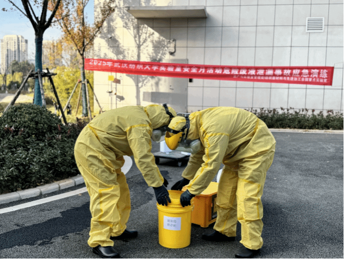 为切实提升实验室安全应急管理水平,强化师生安全风险防范意识与自救互救能力,2025年12月3日(星期三),在资产处的总体部署下,纺织新材料与先进加工全国重点实验室组织老师和全体研一新生在全国重点实验室危化品暂存间外开展了实验室危险废液泄漏事故应急演练学习活动。