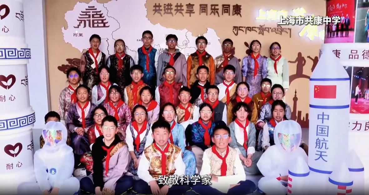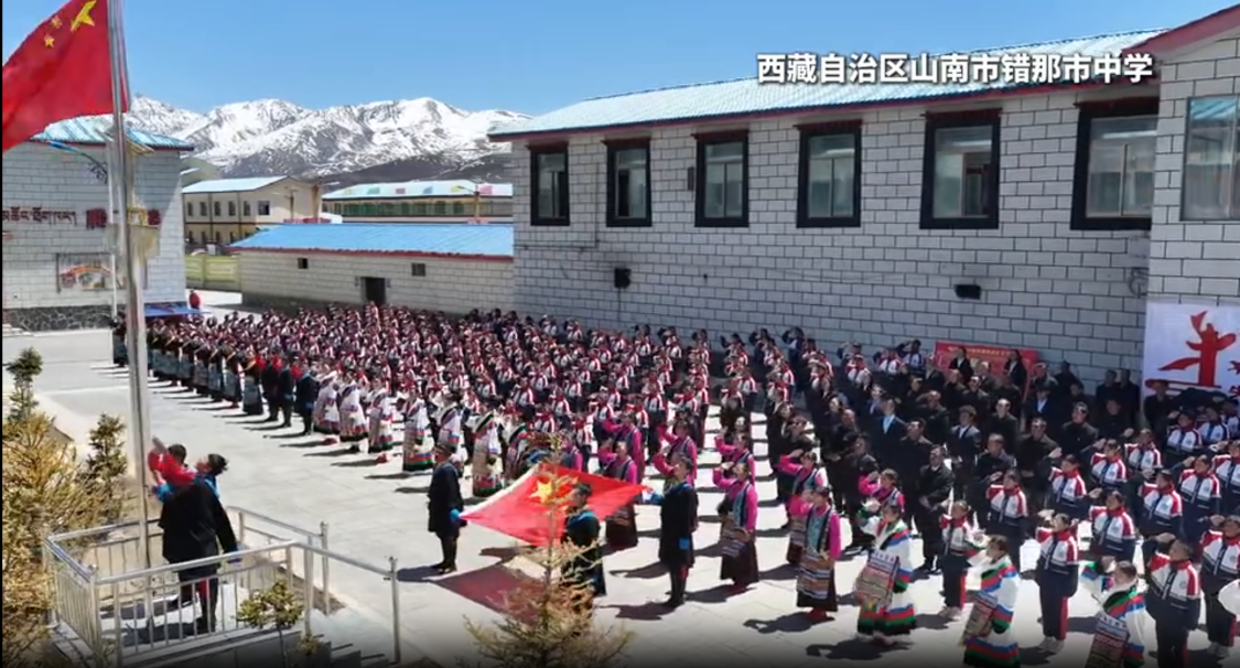 随后,西藏班(校)线上线下同步举行升国旗、唱国歌仪式。鲜艳的五星红旗在武汉主会场与拉萨、山南、上海、常州、三明、宜昌等分会场同步升起,嘹亮的国歌声跨越千里山川,将爱国情、民族心深深镌刻在每一位师生心中。此时此刻,同学们仰望的这面旗帜,与徐卫林院士团队研制的在月球背面飘扬的五星红旗同根同源——一面在地球冉冉升起,一面在太空傲然舒展,共同彰显着中国力量与民族自豪。