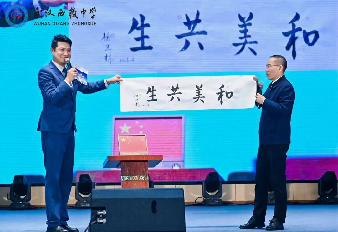 他还现场展示了亲笔题写的 “和美共生” 四字书法作品,寄语各民族师生像石榴籽一样紧紧相拥,团结友爱、守望相助、携手共进。