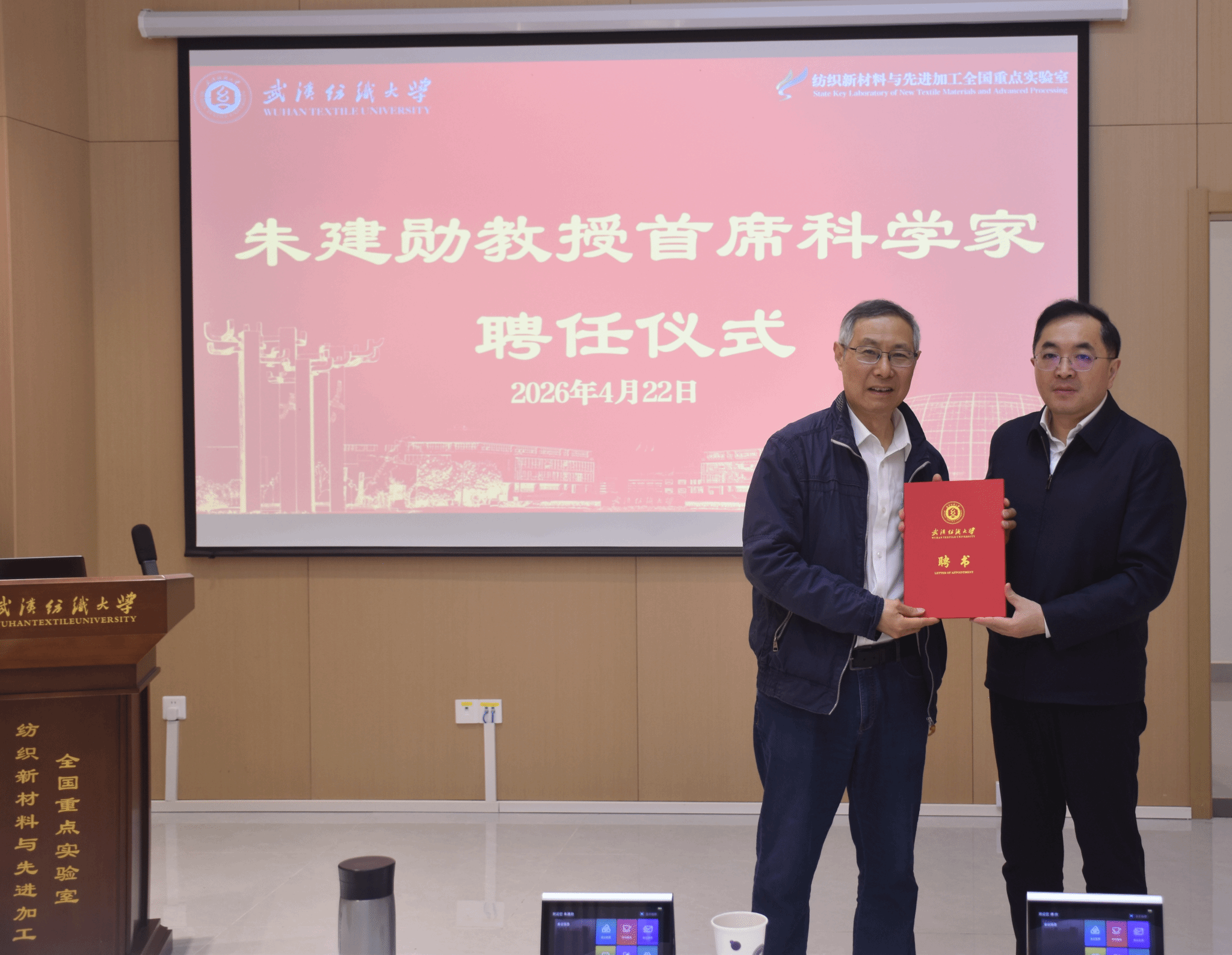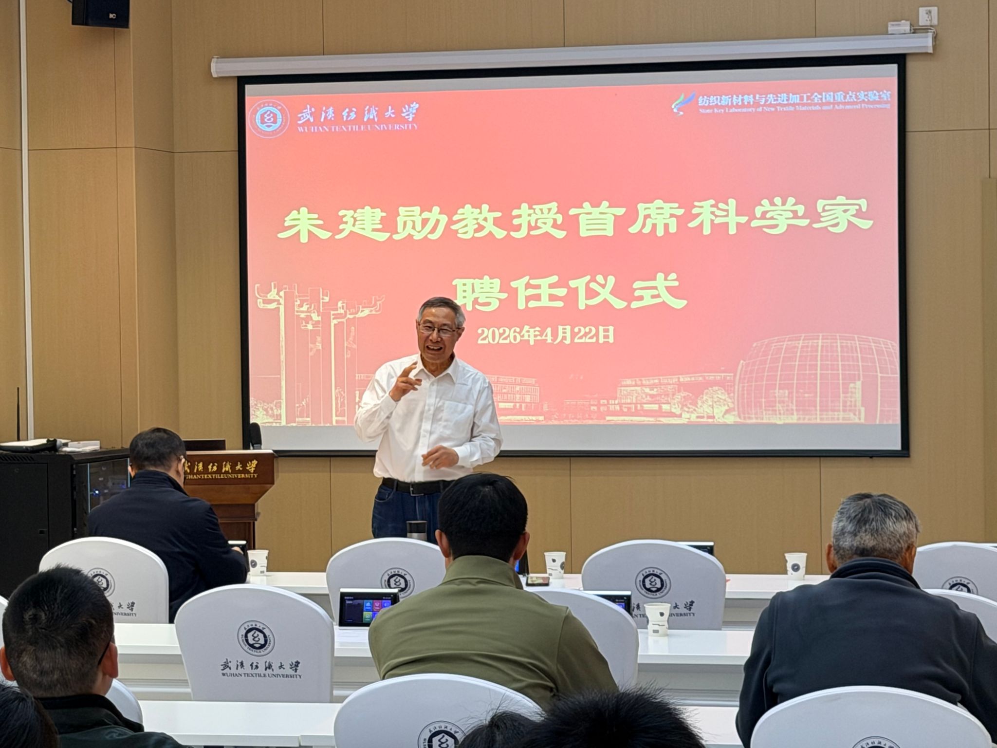 4月22日上午,武汉纺织大学在建全科学中心雄楚厅隆重举行首席科学家聘任仪式。校长傅欣教授出席并为朱建勋教授颁发聘书。纺织新材料与先进加工全国重点实验室常务副主任杨应奎教授主持仪式,全国重点实验室全体教师参加活动。