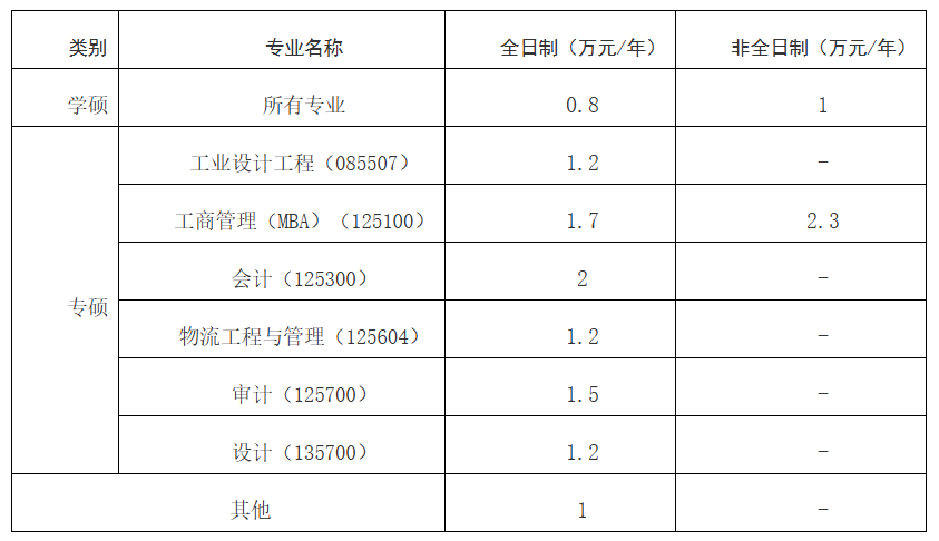 全日制研究生:学习方式为全脱产,非全日制研究生:学习方式为全脱产或半脱产;所有专业学制3年。收费标准见下表: