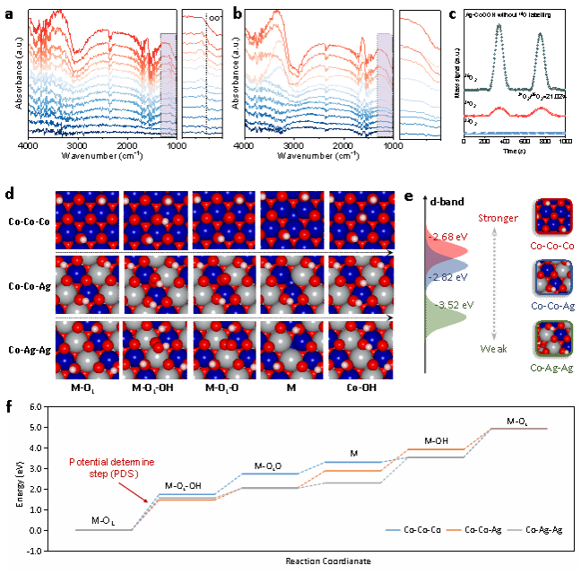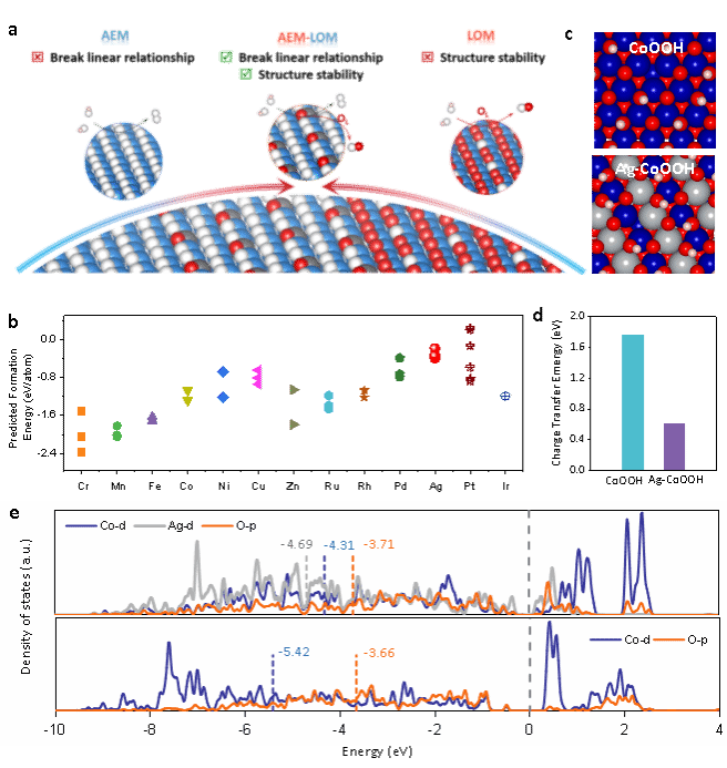 该研究提出一种通过构建Co-Ag原子对激活局域晶格氧的策略,成功在CoOOH中引入Ag原子,形成Co-O-Ag-O-Co配位结构。Ag的掺杂有效增强了Co–O共价性,提升了晶格氧的反应活性,同时通过局部电子结构调控,实现了AEM与LOM的协同机制,从根本上解决了活性与稳定性之间的权衡难题。该Ag-CoOOH催化剂在500 mA cm⁻²电流密度下过电位仅为334 mV,质量活性提升13倍,并在100 mA cm⁻²下稳定运行120小时仅衰减10 mV。进一步将其应用于混合锌电池中,展现出86.2%的高能量效率与超过400小时的循环稳定性。本研究为在不牺牲稳定性的前提下激活晶格氧机制提供了新思路,为下一代高效电催化剂的设计指明了方向。