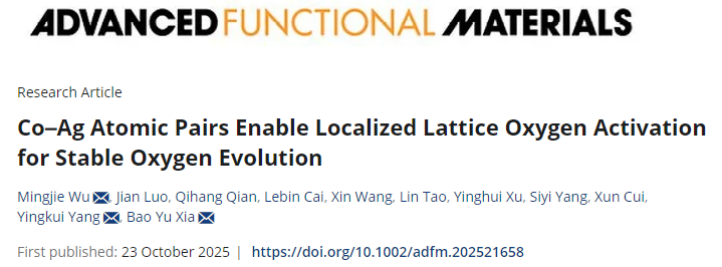 近日,纺织新材料与先进加工全国重点实验室杨应奎教授团队在Advanced Functional Materials期刊发表题为“Co-Ag Atomic Pairs Enable Localized Lattice Oxygen Activation for Stable Oxygen Evolution”的研究论文(论文链接: https://doi.org/10.1002/adfm.202521658),论文第一作者为武明杰教授,通讯作者为杨应奎教授、武明杰教授和华中科技大学夏宝玉教授,武汉纺织大学是第一通讯署名单位。