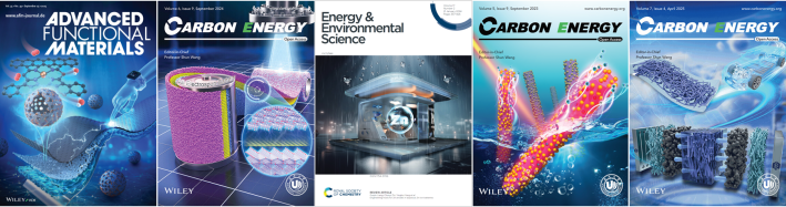 (一)电化学储能领域:在锂离子电池方向,通过原位聚合法可控制备碳纳米管@聚合物“核-壳”异质复合材料(ACS Nano 2024, 18, 23958),解决了聚合物电极导电性差、活性位点少且利用率低的问题,同时提高离子输运能力,构筑了高比特性聚合物基全电池(Angew. Chem. Int Ed. 2024, 63, e202401253);构筑了超细亚纳米线/聚合物复合固态电解质,发现富氢键网络促进了界面锂离子传输(ACS Nano 2025, 19, 29096),阐明了高电压锂金属电池中电极/多相聚合物电解质界面的动态演化、离子输运和耐久性失效机制(Matter 2025, 8, 102168)。在钠离子电池方向,构筑具有连续异质界面的MgTi₃O₇@Na₂Ti₃O₇负极,并在MgTi₃O₇→Na₂Ti₃O₇方向形成内建电场,显著增加储钠位点和离子传输,提高电池比容量和倍率性能(ACS Nano 2025, 19, 10337);基于原位电诱导重构苝二亚胺二钠盐,优化有机正极微结构,构建了超高倍率和超长寿命钠离子电池(ACS Nano 2025, 19, 13097)。在锌离子电池方向,提出了金属锌负极宿主设计的新观点、新思路(Energy Environ. Sci. 2024, 17, 369),通过氧空位工程与二维范德华异质结,构筑了兼具“纳米泵-限域催化”特性的碘正极材料(Matter 2025, 8, 102154),并以两性离子液体为电解液添加剂重构锌负极、碘正极界面,抑制锌枝晶生长、碘单质溶解和多碘离子形成(Nature Commun. 2025, 16, 5565),在超高倍率、超长循环下仍保持其高容量、高稳定性,推动了锌基电池实用化进程。