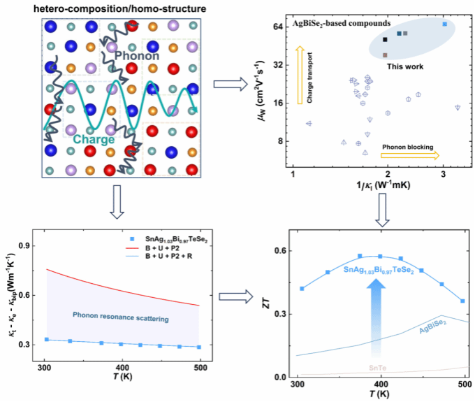 近日,该成果以Hetero-Composition and Homo-Structure Decoupling Charge and Phonon Properties in p-Type Thermoelectric SnAgBiTeSe2”为题发表于Angewandte Chemie International Edition (链接:doi.org/10.1002/anie.202521387),武汉纺织大学是第一通讯署名单位,通讯作者是陈玲教授和吴立明教授。