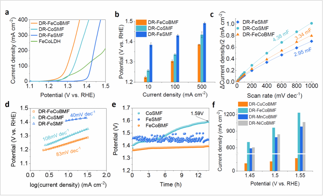 研究表明,该动态重构后的催化剂(DR-FeCoBMF)在尿素氧化反应中表现出优异的性能(图2):达到10 mA cm-2电流密度仅需1.222 V,比商业IrO2低188 mV,氮氧化物法拉第效率高达87.7%。在工业级电流下,该催化剂可在1 A cm-2条件下稳定运行100小时,性能无明显衰减,相比传统水电解节能13%。结合光谱表征与理论计算,研究进一步揭示,配体空位诱导的金属二聚化将C–N键裂解能由1.33 eV降至0.80 eV,并将速控步从非电化学步骤(C–N裂解)转变为电化学步骤(*NO氧化),显著降低了反应活化能。