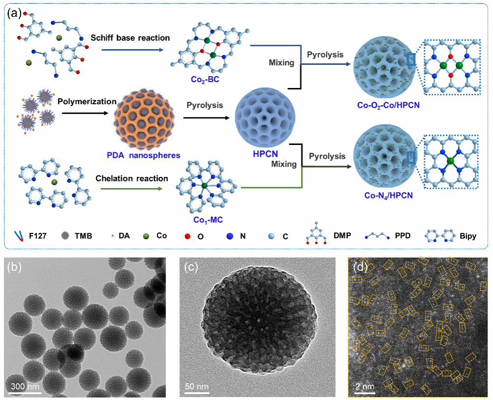针对上述瓶颈,研究团队提出同质双核大环配合物介导策略,在分级多孔碳纳米球载体上精准构筑了结构明确的双氧桥联钴双原子催化剂(Co-O2-Co/HPCN)。该材料通过均一分散的钴双原子位点与分级多孔碳骨架之间的协同作用,实现了电子结构与传质环境的双重优化。